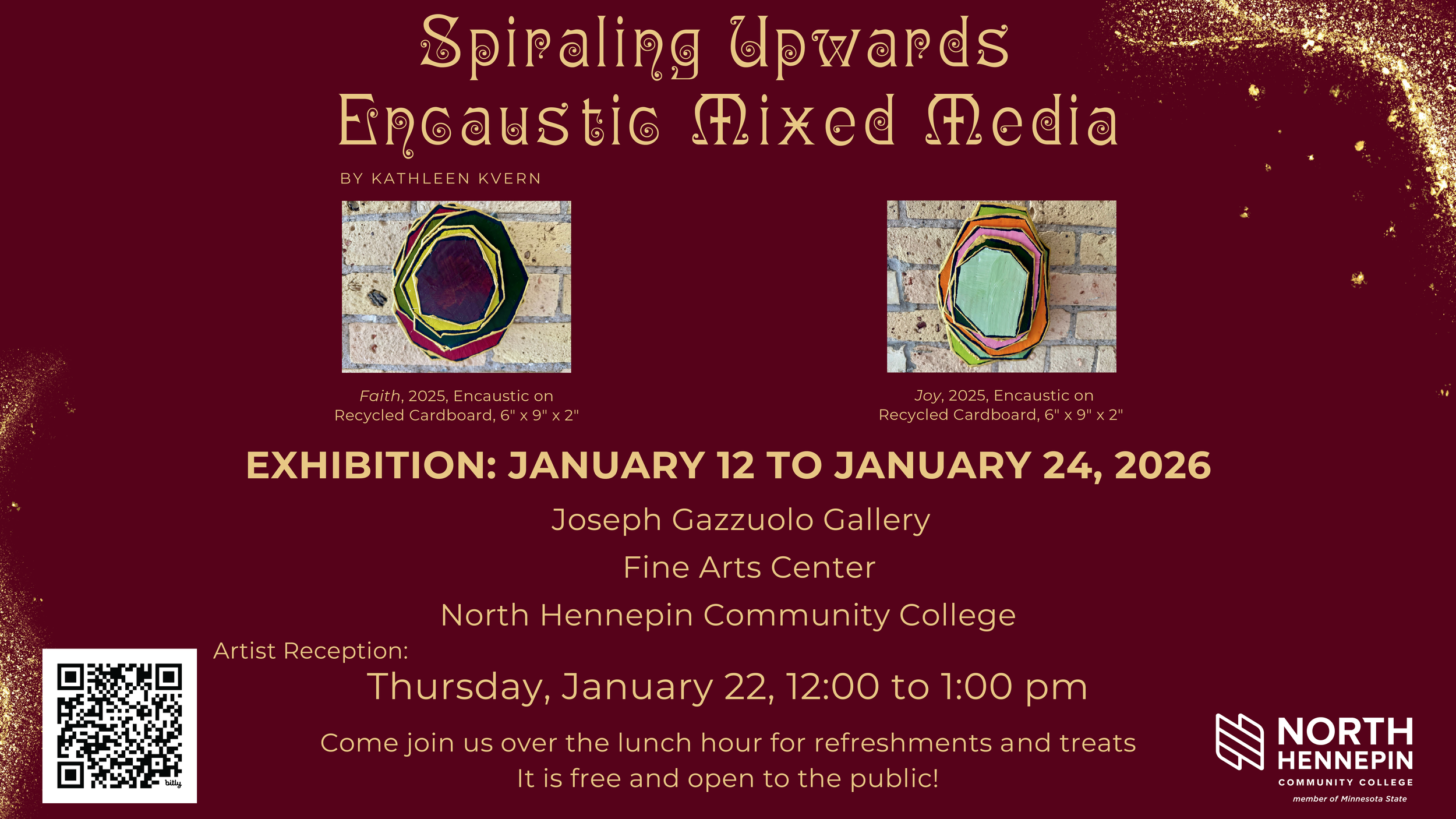 Spiraling Upwards is a Solo Exhibition featuring my series of recycled cardboard encaustic sculptural paintings. Through this work I am exploring the transformative power of joy. Inspired by research on positive emotions, I reflect on how even brief moments of joy can create an upward spiral, fostering more happiness and resilience over time. This series embraces movement, texture, and renewal—turning discarded materials into layered, luminous compositions that celebrate optimism and possibility. By working with encaustic, a medium shaped by fire and transformation, I aim to capture the energy of joy as a force that uplifts and sustains us.